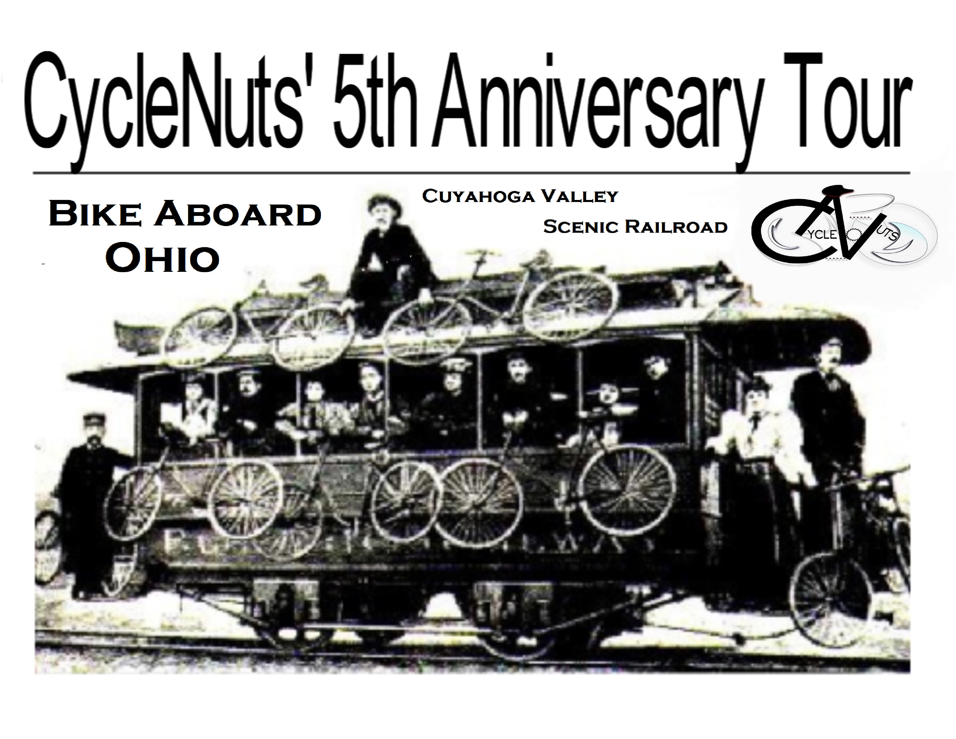 Saturday, August 21st CycleNuts 5th Anniversary Tour - Bike Aboard Cuyahoga Valley Scenic Railway Event Organizer - Jef This tour celebrates CycleNuts' 5th Anniversary aboard the Cuyahoga Valley Scenic Railroad in N.E. Ohio. On the CVSR Bike Aboard our bikes get loaded with us for a scenic train ride through Cuyahoga Valley National Park. At the end of the line we depart to a nearby spot for tasty bites and beverages. And then we bike back to the starting station. Our 27 mile return ride is along the historic Ohio-Erie canal on the towpath trail, which is mostly crushed stone (messy but hard enough for road bike tires). Those that cannot make the whole 27 mile return ride have the option of flagging down the train at several stops along the towpath trail ($5/per person/bike). Train ride is paid at time of loading - $5 - arrive early - train leaves at 11:00 AM sharp! Points of interest: CVSR, scenic Cuyahoga Valley National Park, Ohio-Erie Canal and locks, Cuyahoga River, and downtown Akron. STARTing spot and tasty midway stop details are revealed with your ticket purchase. CLICK HERE